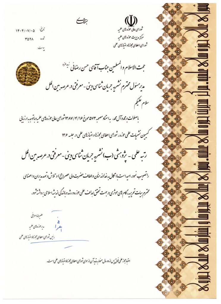 نشریه جریان شناسی دینی – معرفتی در عرصه بین الملل حائز رتبه علمی – پژوهشی (ب) شد
